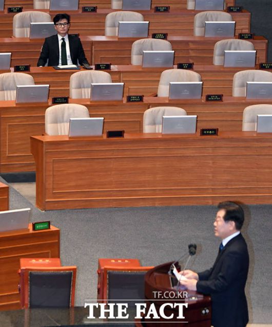 한 장관은 이날 오후 국회 본회의장에서 이 대표에 대한 체포동의안과 관련해 "이번 체포동의안은, 다른 국민들과 똑같이 법원의 심사를 받게 해달라는, '판사 앞에 나오게만 해달라'는 요청"이라며 이같이 밝혔다.