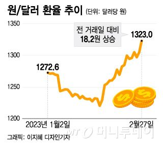 27일 서울 외환시장에서 원/달러 환율은 전 거래일보다 18.2원 오른 1323원에 거래를 마쳤다. 종가 기준으로 지난해 11월 29일(1326.6원) 이후 최고 수준이다.