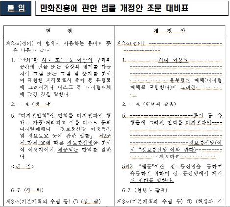 이번 개정안은 만화계에서 오랫동안 바라온 것으로, 만화 정의를 수정해 웹툰을 포함하고 웹툰 정의를 신설했다. 명확한 기준 없이 혼용됐던 ‘만화’와 ‘웹툰’을 구분해 변화하는 만화산업의 환경에 맞도록 규정한 것이다.