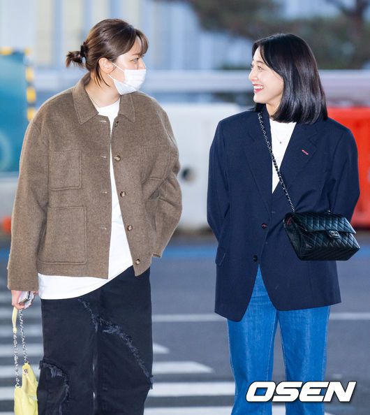 [OSEN=인천공항, 민경훈 기자] 그룹 트와이스(TWICE-나연, 정연, 모모, 사나, 지효, 미나, 다현, 채영, 쯔위)가 27일 오후 인천 중구 운서동 인천국제공항을 통해 해외 일정 참석 차 미국 로스앤젤레스로 출국했다. 트와이스 정연과 지효가 출국장으로 이동하며 포즈를 취하고 있다. 2023.02.27 / rumi@osen.co.kr