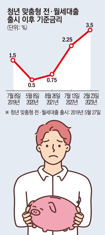 중ㆍ저소득 청년층 주거 부담 경감을 위한 ‘청년 맞춤형 전월세 대출(이하 청년 전ㆍ월세 대출)’은 출시 당시인 2019년 ‘저금리’를 특징으로 내세웠지만 최근 기준금리 인상에 따라 금리가 치솟으면서 청년에 부담이 되고 있다.