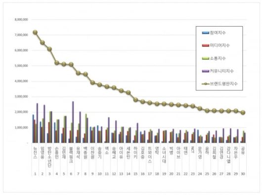 3위, 방탄소년단 브랜드는 참여지수 630,816 미디어지수 1,349,144 소통지수 2,051,433 커뮤니티지수 2,055,652가 되면서 브랜드평판지수 6,087,045로 분석됐다. 지난 1월 브랜드평판지수 7,527,175와 비교해보면 19.13% 하락했다.