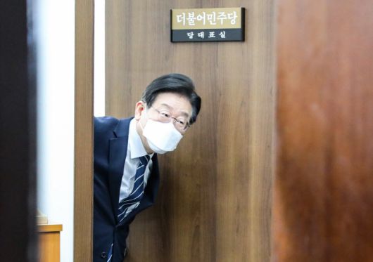 이재명 더불어민주당 대표가 28일 오후 서울 여의도 국회 당대표실 문을 열고 고개를 내밀고 있다 (사진=뉴스1) |