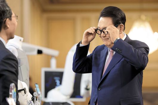 뇌전증 감지 글라스 써보는 尹대통령 - 윤석열 대통령이 28일 청와대 영빈관에서 열린 바이오헬스 신시장 창출 전략 회의에 앞서 뇌전증 감지 기기인 ‘제로 글라스’를 써보고 있다. 윤 대통령은 이날 회의에서 “바이오헬스 산업을 제2의 반도체 산업으로 키워야 한다”고 말했다. /대통령실 |