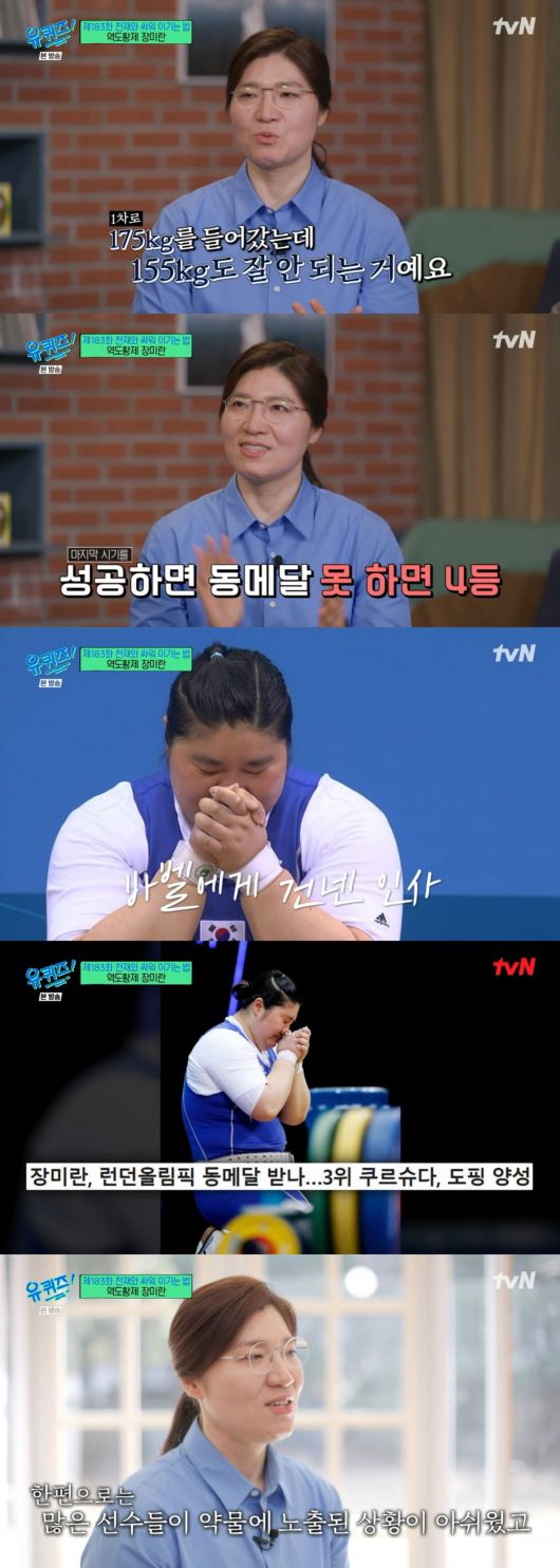 1일 방송된 tvN ‘유 퀴즈 온 더 블럭’에서는 지난주에 이어 역도황제 장미란 선수가 출연해 그동안의 역도 인생을 돌아봤다.