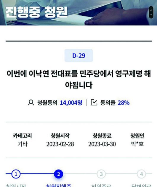 이 대표 체포동의안 표결 다음 날인 지난달 28일 당 청원게시판에 ‘이 전 대표를 영구 제명하라’는 글이 올라온 지 하루 만인 이달 1일 1만4000여 명이 동의했다. 이들은 청원 취지에서 “지난 대선 때 대장동 건을 최초로 터뜨려 놓고 이 대표에게 사과도 하지 않고 미국으로 갔다”며 “어제 체포동의안 표결에서 당내 반란표가 나오게 만든 것도 이 전 대표가 꾸몄다고 봐도 무리는 아니다”라고 주장했다. 체포동의안에 찬성한 의원 명단 공개 청원에 동의하는 수도 이날 1만7000명을 넘었다.