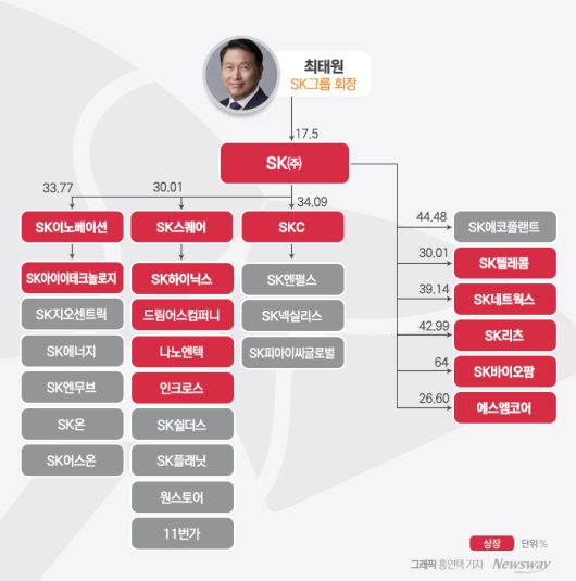 SK그룹은 SK㈜ 지분 17.5%를 쥐고 있는 최태원 회장이 180여개 계열사를 거느린 지배구조 틀을 완전히 갖췄다. 그룹 지주회사 SK㈜가 다수의 핵심 계열사 최대주주로 있어 사실상 최 회장의 지배력이 닿는다. 최근 공정거래위원회가 발표한 대기업집단 계열사 규모를 보면 SK는 201개(상장사 20개)로 국내 대기업 중 가장 많다. 사업다각화 과정에서 인수하거나 합작한 계열사가 크게 늘어났던 게 배경이다.