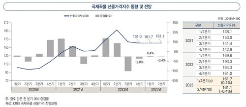 또 2분기 식용·사료용 곡물 수입단가지수는 163.7, 158.1로 하락세를 이어갈 것으로 내다봤다.