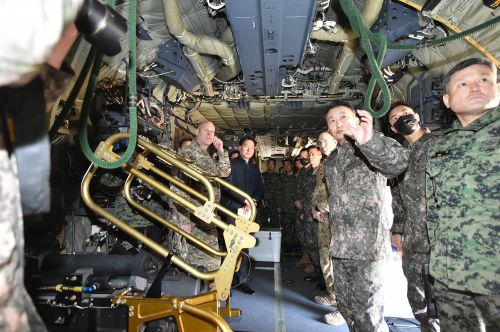 합동참모본부는 김승겸(오른쪽 세번째) 합참의장이 지난달 27일 한미 연합 특수작전훈련 현장을 찾아 장병들을 격려했다고 2일 밝혔다. 사진은 김 의장이 미군 AC130J 공격기 내부를 둘러보는 모습. 합동참모본부 제공 |