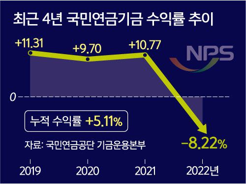 국민연금의 지난해 수익률은 1988년 국민연금 제도가 도입된 이후 가장 큰 손실 폭이다. 지금까지 국민연금 수익률이 마이너스를 기록한 것은 이번을 포함해 모두 세 차례다. 첫 번째는 글로벌 금융위기가 닥친 2008년 -0.18%의 수익률이다. 두 번째는 미·중 간 무역전쟁과 세계적인 통화긴축의 여파로 2018년 수익률이 -0.92%로 떨어진 바 있다. 이번이 세 번째로 손실 폭은 역대 최악이다. 국내외 주식과 채권투자에서 10% 이상의 손실을 봤다. 전 세계 인플레이션 심화에 따른 미국의 공격적인 긴축 기조와 러시아·우크라이나 전쟁 장기화로 주식시장 불안요인이 가중됐기 때문으로 분석됐다.