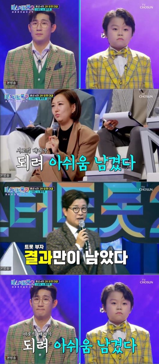 2일 오후 10시 방송된 TV CHOSUN '미스터트롯2-새로운 전설의 시작'에서는 준결승에 진출할 10명의 최정예 멤버를 가려낼 본선 4차전 '1대1 라이벌 매치' 2라운드가 펼쳐졌다.