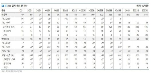 천보의 올해 예상 영업이익은 전년보다 68% 늘어난 994억원이다. 2022년 4700t에서 2023년 1만7000t으로 생산능력이 확대되면서 외형성장이 본격화될 것으로 기대된다.
