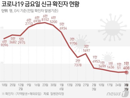 (서울=뉴스1) 윤주희 디자이너 = 질병관리청 중앙방역대책본부(방대본)는 3일 0시 기준 신종 코로나바이러스 감염증(코로나19) 신규 확진자가 1만408명 발생했다고 밝혔다.ajsj999@news1.krCopyright ⓒ 뉴스1. All rights reserved. 무단 전재 및 재배포 금지.