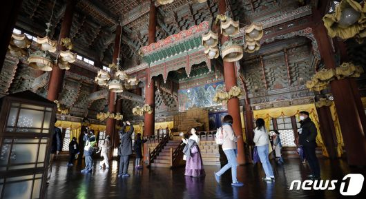 (서울=뉴스1) 박지혜 기자 = 3일 오전 서울 창덕궁을 찾은 관람객들이 인정전 내부를 관람하고 있다. 국보로 지정된 인정전은 왕의 즉위식, 신하들의 하례, 외국 사신의 접견 등 중요하고 공식적인 의식을 치르던 곳이다. 문화재청 궁능유적본부 창덕궁관리소는 오는 4월30일까지 매주 금·토·일요일 오전 10시30분에 창덕궁의 으뜸 전각인 '인정전' 내부를 관람할 수 있는 프로그램을 운영한다. 2023.3.3/뉴스1
