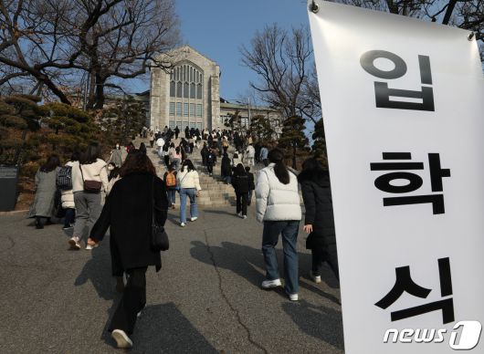 24일 오전 서울 서대문구 이화여자대학교에서 신입생들과 학부모들이 2023학년도 입학식에 참석하고 있다. 이화여대는 지난 코로나19 사태 이후 4년 만에 대면 입학식으로 진행했으며 총 3,547명의 신입생이 입학했다. 2023.2.24/뉴스1 ⓒ News1 신웅수 기자 |