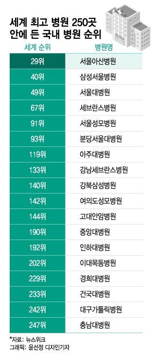 국내 병원은 18곳이 세계 최고 병원 250위 안에 들었다. 서울아산병원은 국내 병원 중 가장 높은 세계 29위에 올랐다. 지난해 평가(30위)때 보다 한 계단 상승한 수치다. 국내에서는 5년 연속 1위를 차지했다.