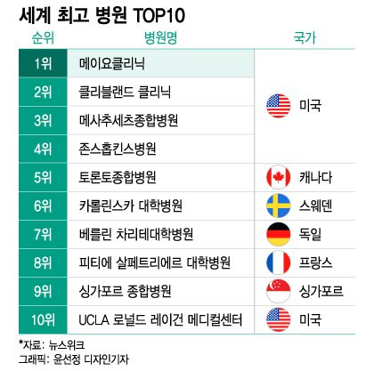 이번 조사에서 미국 메이요클리닉이 세계 1위 병원에 올라섰다. 이어 미국 클리블랜드클리닉, 미국 메사추세츠종합병원, 미국 존스홉킨스병원, 캐나다 토론토종합병원이 세계 2~5위로 선정됐다.