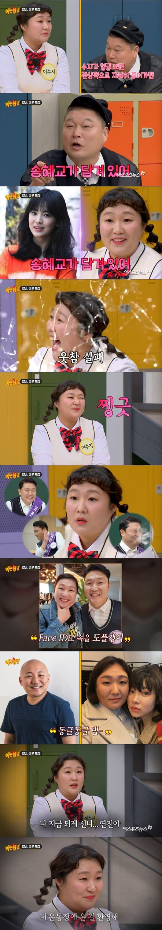 강호동은 이수지에게 "수지가 얼굴 보면 관상적으로 자세히 들어가면 송혜교가 담겨 있다"고 말해 이수지를 웃게 했다.
