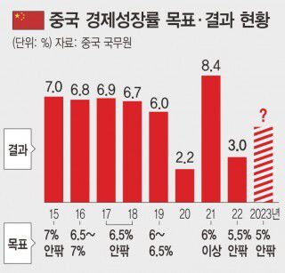 중국 정부가 5일 제시한 올해 경제성장률 목표 ‘5% 안팎’은 목표치로는 역대 최저 수준이고, 시장 예상치보다도 낮다. 중국의 코로나19 사태가 안정 국면으로 접어들긴 했지만, 미국과의 전략 경쟁 심화 및 우크라이나 전쟁 등으로 세계 경제 불안 상황 등을 고려한 것으로 보인다.