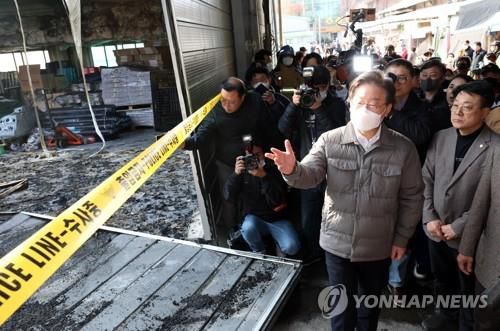 (인천=연합뉴스) 윤태현 기자 = 더불어민주당 이재명 대표가 5일 인천 현대시장 화재 현장을 찾아 피해 상인들을 위로하고 생계 대책을 마련하겠다고 약속했다.