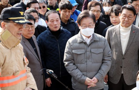 현대시장 화재 발생 경위 듣는 이재명 대표 - 이재명 더불어민주당 이재명 대표가 5일 오후 인천시 동구 현대시장 화재 현장에서 소방당국 관계자로부터 화재 발생 경위를 듣고 있다. 2023.3.5 연합뉴스 |