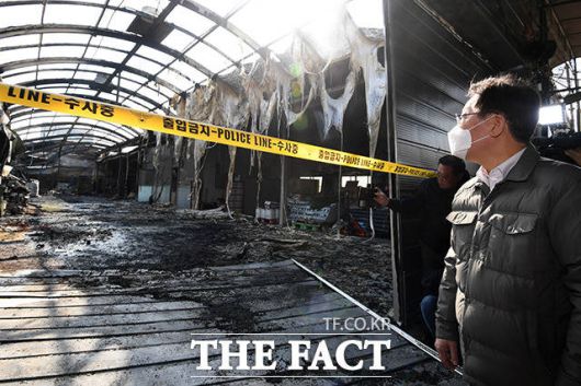 화재는 전날 술에 취한 40대 남성이 방화해 발생한 것으로 추정된다. 경찰은 시장 주변 폐쇄회로(CCTV) 영상 등을 토대로 이 남성을 검거해 조사하고 있다.