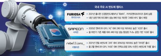 국내에서 NPU를 개발하는 AI 반도체 팹리스 업체로는 퓨리오사AI·리벨리온·사피온이 손꼽힌다. 이 중 퓨리오사AI는 AMD와 삼성전자 등에서 일했던 백준호 대표가 2017년 설립한 업체로 2021년 신경망 반도체(NPU) ‘워보이’를 내놓으며 카카오엔터프라이즈 등에 관련 제품을 납품하고 있다. 퓨리오사AI는 내년 초 2세대 칩을 선보이며 시장 장악에 속도를 낸다는 계획이다. 현재 5나노 기반의 2세대 칩 설계를 마무리하고 디자인하우스에 제품을 맡긴 상태다. 디자인하우스가 2세대 칩을 파운드리(반도체 위탁 생산 전문)에 맡기면 내년 초부터 본격 양산이 시작될 것으로 전망된다. 퓨리오사AI의 2세대 칩은 1세대 칩 대비 하드웨어 성능은 8배, 데이터 전송속도는 30배가량 향상될 것으로 예상된다.