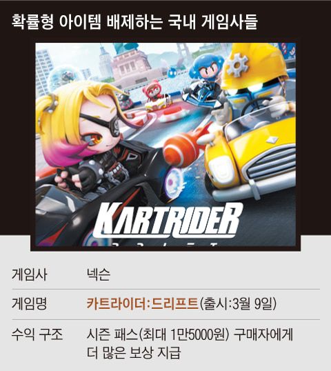하지만 넥슨은 최신작에선 이런 방식의 뽑기형 아이템 기능을 아예 지웠다. 오는 9일 정식 출시하는 ‘카트라이더: 드리프트’에서도 확률형 아이템을 없앴다. 대신 7500~1만5000원까지 정액 요금을 내면 다양한 차량, 캐릭터를 보상받을 기회를 더 많이 주는 일종의 정기권인 ‘레이싱 패스’라는 새로운 요금제를 적용하기로 했다.