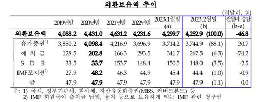 한은이 6일 발표한 외환보유액 통계에 따르면 2월 말 기준 우리나라의 외환보유액은 4천252억9천만달러로, 1월 말(4천299억7천만달러)보다 46억8천만달러 감소했다.