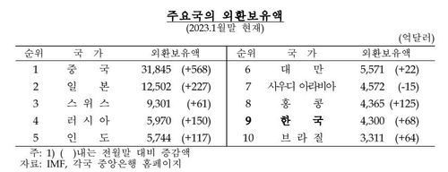 한국의 외환보유액 규모는 1월 말 기준(4천300억달러)으로 세계 9위 수준이다.