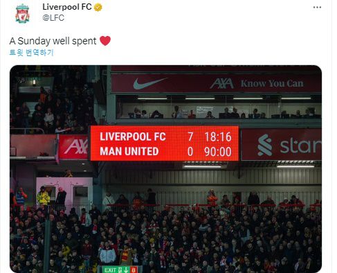 약 100년이 넘는 클럽 역사 속에서 맨유전 7골 차 대승을 맛본 게 처음인 리버풀은 곧바로 이를 기록으로 남겼다. 리버풀은 구단 공식 SNS에 "알차게 보낸 일요일"이라며 7-0 스코어가 적혀 있는 전광판을 게시했다.