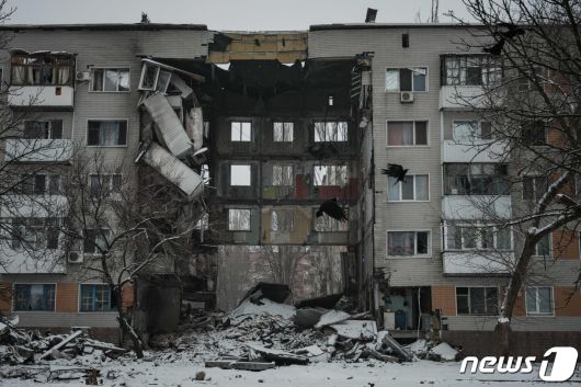 지난 1월30일(현지시간) 우크라이나 도네츠크 바흐무트에서 러시아 군의 포격을 받아 박살난 건물이 보인다. ⓒ AFP=뉴스1 ⓒ News1 우동명 기자 |