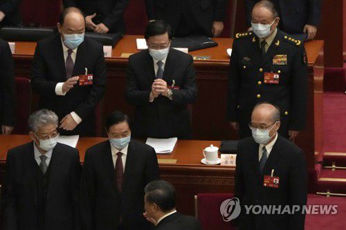 (AP=연합뉴스) 지난 5일 중국 전인대 개막식이 열린 베이징 인민대회당에서 존 리(맨 윗줄 가운데) 홍콩 행정장관이 두손을 모아 시진핑(맨 아래) 중국 국가주석에게 인사하는 모습. 2023.3.6. |