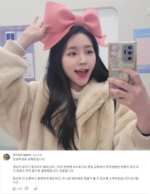 성해은은 지난 5일 개인 유튜브채널 '해피해은 HAEPPY' 커뮤니티를 통해 "안녕하세요 성해은입니다. 영상이 갑자기 없어져서 놀라셨죠! 저의 첫 번째 브이로그는 편집 과정에서 부주의했던 부분이 있어 다시 업로드 하지 않기로 결정했습니다. 죄송합니다"고 전했다.