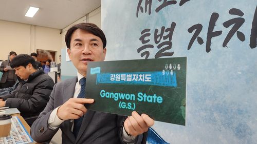 김진태 강원지사가 6일 강원특별자치도 영문 표기를 공개하고 있다. [촬영 이해용] |