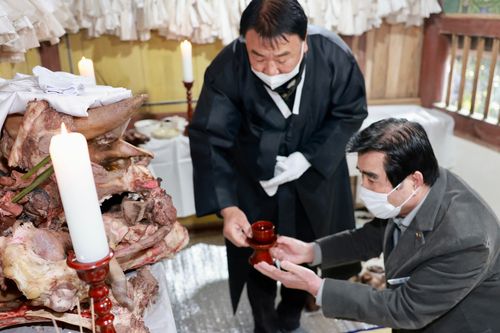 (보령=연합뉴스) 정찬욱 기자 = 마을의 안녕과 풍어, 뱃길 안전을 기원하는 전통 행사인 충남 보령시 외연도 풍어당제가 6일 천연기념물인 외연도 상록수림 일대에서 진행됐다.