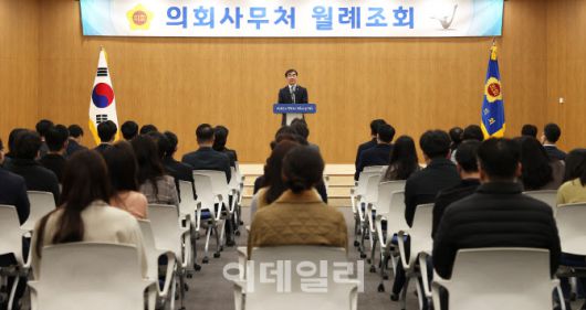 염종현 경기도의회 의장이 6일 의회사무처 3월 월례조회를 진행하고 있다.(사진=경기도의회) |