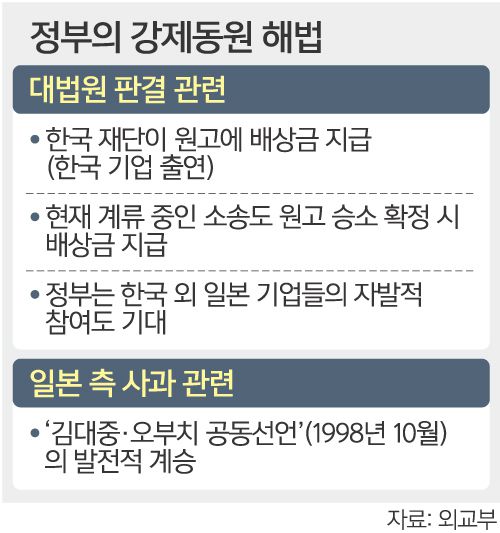 정부의 해법은 일제강제동원피해자지원재단이 2018년 대법원 3건의 확정판결에서 승소판결을 받은 피해자 15명에 배상금과 지연이자를 지급하는 것이다. 정부는 대법원에 계류 중인 다른 강제동원 관련 소송이 원고 승소로 확정될 경우 같은 절차에 따라 배상금을 지급할 방침이다.