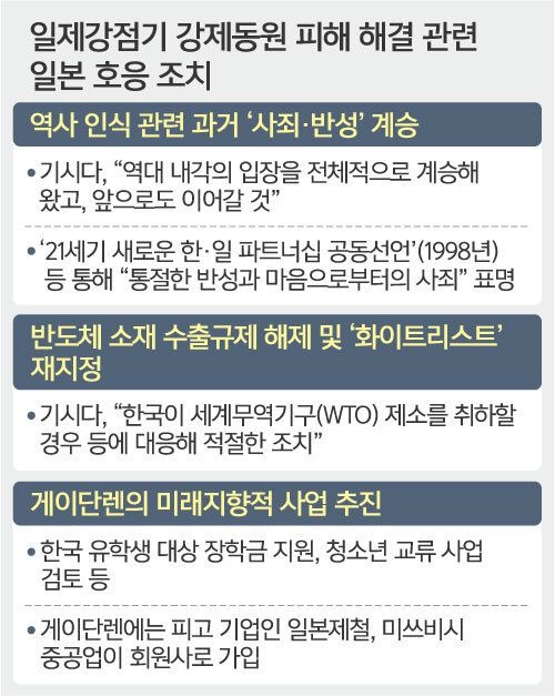 기시다 총리의 직접 사죄, 반성의 의사는 전해지지 않았다. 기시다 총리는 이날 참의원(상원) 예산위원회에서 사토 마사히사(佐藤正久) 자민당 의원의 관련 질의에 “양국 외교당국 간에 조율 중이라 구체적으로 말하는 것이 적절치 않다”고 답변을 피했다. 앞서 일본 주요 언론은 기시다 총리가 직접 식민지 지배에 대한 사죄와 반성이 담긴 역대 내각 담화와 한·일 공동선언을 계승한다는 입장을 직접 표명하는 방향으로 일본 정부가 조율하고 있다고 보도한 바 있다. 한국 정부의 강제동원 해결책 발표자가 박진 외교부 장관이어서 일본 정부에서도 하야시 외무상으로 급을 낮춘 것으로 보인다.