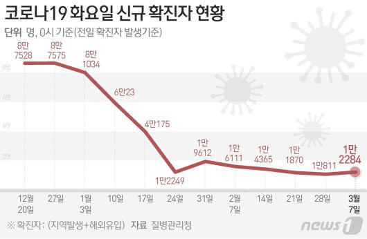 (서울=뉴스1) 김초희 디자이너 = 질병관리청 중앙방역대책본부(방대본)는 7일 0시 기준 신종 코로나바이러스 감염증(코로나19) 신규 확진자가 1만2284명 발생했다고 밝혔다.a_a@news1.krCopyright ⓒ 뉴스1. All rights reserved. 무단 전재 및 재배포 금지.