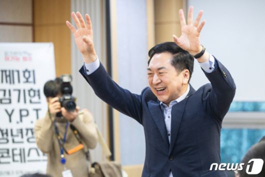김기현 국민의힘 당대표 후보가 5일 서울 여의도 국회 의원회관에서 열린 제1회 김기현 Y.P.T(Young People Together) 청년정책 콘테스트에서 참석 청년들을 향해 손을 들어 인사하고 있다. 2023.3.5/뉴스1 |