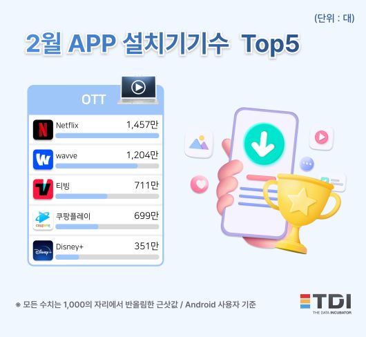 2월 기준 설치 수 Top5는 △Netflix(1,457만 대) △wavve(1,204만 대) △티빙(711만 대) △쿠팡플레이(699만 대) △Disney+(351만 대) 순이다.