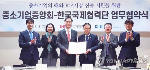 (서울=연합뉴스) 김호천 기자 = 한국국제협력단(KOICA)과 중소기업중앙회(KBIZ)는 7일 서울 여의도 중소기업중앙회 리더스룸에서 중소기업의 해외 공적개발원조(ODA) 시장 진출을 지원하기 위한 업무 협약을 체결했다.