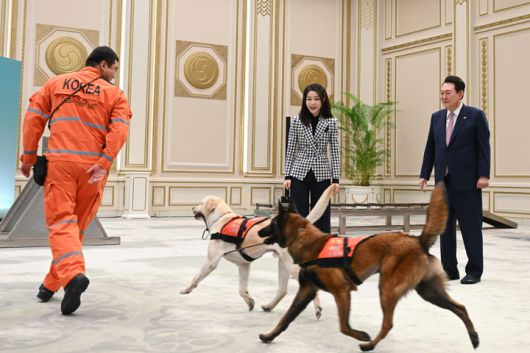[서울=뉴시스] 윤석열 대통령과 부인 김건희 여사가 7일 청와대 영빈관에서 열린 튀르키예 지진 파견 구조견 격려 행사에서 119구조견들의 시연을 참관하고 있다. (사진=대통령실 제공) 2023.03.07. photo@newsis.com *재판매 및 DB 금지