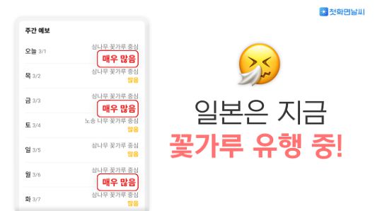 '첫화면 날씨' 측은 일본 여행 전 놓치지 말아야 할 사항으로 '꽃가루 지수'를 꼽았다. '첫화면 날씨' 관계자는 "일본에서는 최근 30여년간 꽃가루로 인한 환자가 늘고 있는 상황"이라며 "특히 삼나무 꽃가루로 인한 알레르기는 2월 하순부터 5월 초순 사이에 심각하다"고 말했다. 이어 "일본 환경성에 따르면 올해 수꽃의 양은 34개 도부현 가운데 도호쿠 남부에서 규슈에 걸친 23개 도부현에서 최근 10년간의 평균을 웃돌 전망"이라고 덧붙였다.