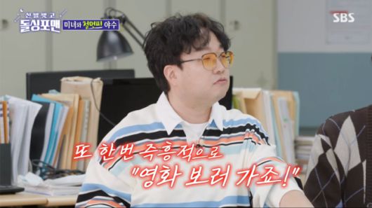 박휘순은 일대일로 고깃집 식사를 하고 즉흥적으로 영화를 보러 가자고 했다고. 박휘순은 “팝콘을 먹는데 (손이 스치면서) 10년 만에 느낀 찌릿함이었다. 영화에만 집중하는 모습이 숨멎”이라고 말했다. 이를 들은 탁재훈은 “너 진짜 죽겠다”라고 말하기도.