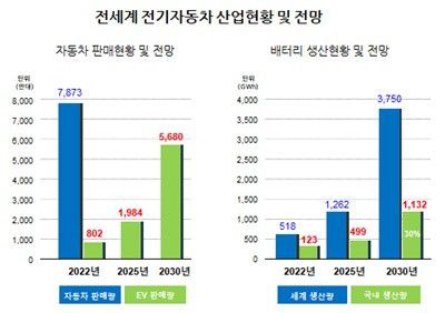 전기차의 가장 중요한 부품인 배터리는 2022년 518GWh가 생산됐으며, 전년 대비 74% 증가했다. 국내에서는 123GWh가 생산돼 전년 대비 34% 늘었고, 글로벌 전체 생산량의 24%를 차지했다. 글로벌 배터리 시장은 2025년 1,262GWh, 2030년 3,750GWh가 생산될 것으로 전망되며, 국내에서는 2030년 1,132GWh를 생산해 글로벌 생산량의 30%를 차지할 전망이다.