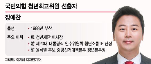 장예찬 청년 최고위원은 1988년 부산에서 태어났다. 장 최고위원은 네덜란드 마스트리흐트 음악학교에서 재즈 드럼을 전공했다. 귀국 후 장 최고위원은 음악 학원을 운영한 것으로 알려져 있다. 여론조사 전문업체 서던포스트에서 정책실장을 지냈다. 웹진 '자유주의'를 발간하며 청년 보수 논객으로 활동했다. 장 최고위원은 이후 정치평론가로 활동했다.
