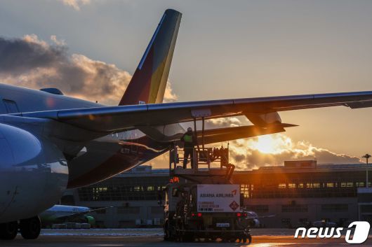 아시아나항공 관계자가 지난 22일 오전 인천국제공항 활주로에서 운항을 앞둔 비행기에 주유를 하며 마지막 점검을 하고 있다.2022.12.28/뉴스1 ⓒ News1 임세영 기자 |