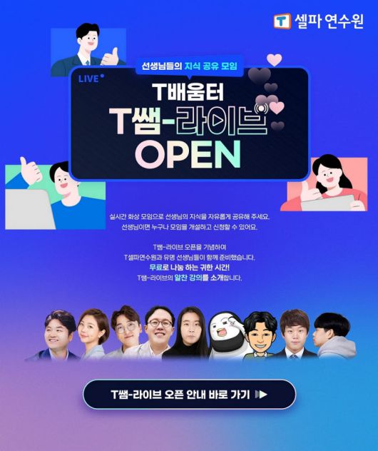 김황 천재교육 T셀파 전략본부 부문장은 “T셀파 원격연수원에서 신학기 학업 준비에 바쁜 선생님을 위해 꼭 필요하고 유용한 강의만 골라 실시간 라이브로 제공한다”며 “오픈 이벤트 기간에 이름만 들어도 아는 유명 강사 강의를 무료로 들을 기회를 마련했으니 많은 관심과 참여 바란다”고 전했다.